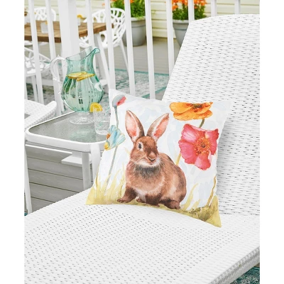 No matter the weather you can bring a ray of sunshine to your porch, balcony, living room, bedroom or patio with our Spring Softies accent pillow collection. This durable indoor/outdoor pillow collection features a printed spring bunny design in a unique watercolor style on quick-drying polyester cover. Find more from the Spring Softies collection, created in collaboration with artist Lisa Audit, to transform your home for the season of new beginnings. Crafted with a polyester cover and finished with a clean knife edge, these pillows are filled with plush polyester filling and sewn closed. Design is printed on one side, back of pillow is solid white. Size: 18 x 18 inches. Spot cleaning recommended.
